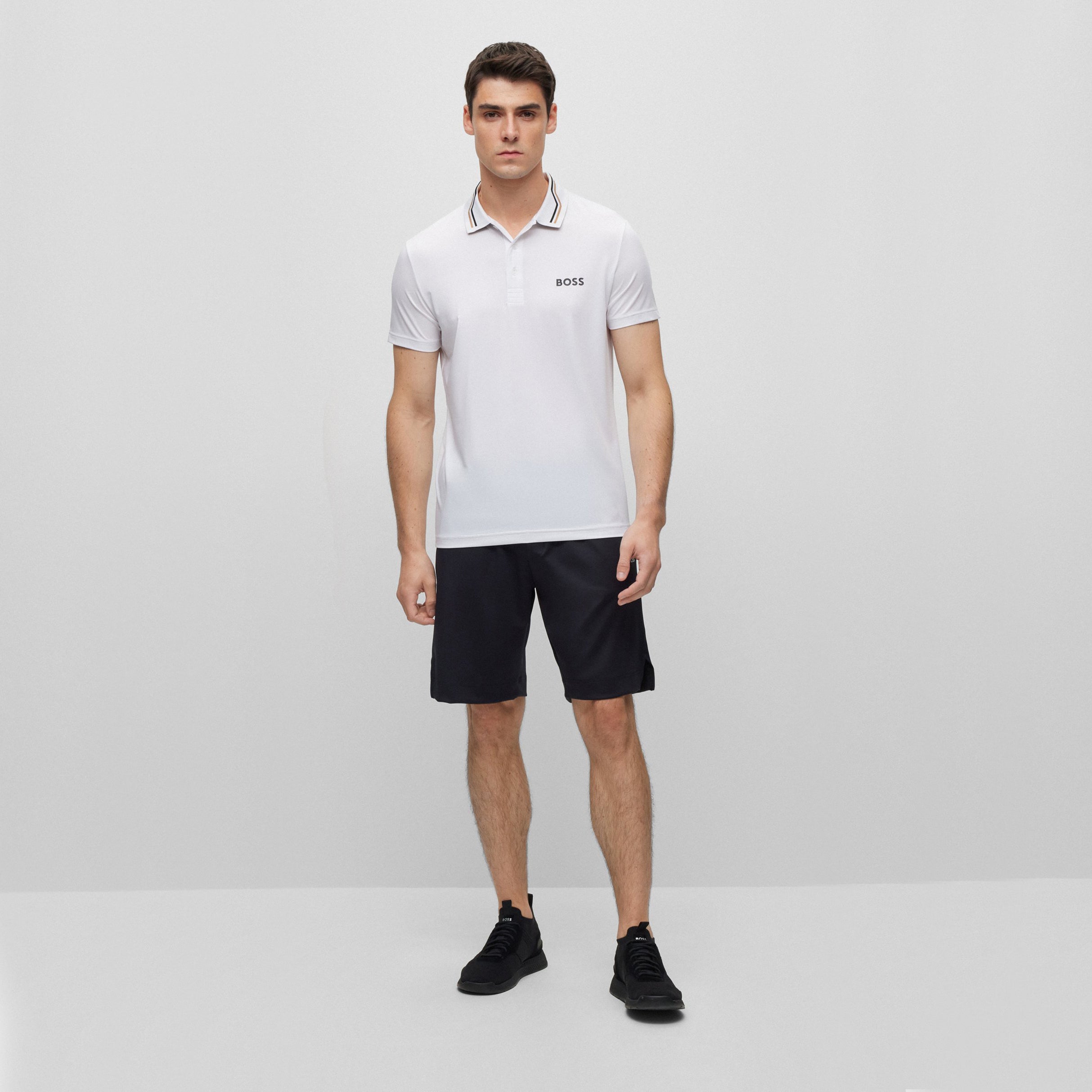 A short-sleeved polo shirt cut to a straight fit in stretch jersey with a collar stripe and contrast logo by BOSS Menswear. Part of the dynamic BOSS x Matteo Berrettini capsule collection, co-created by the Italian professional tennis player.