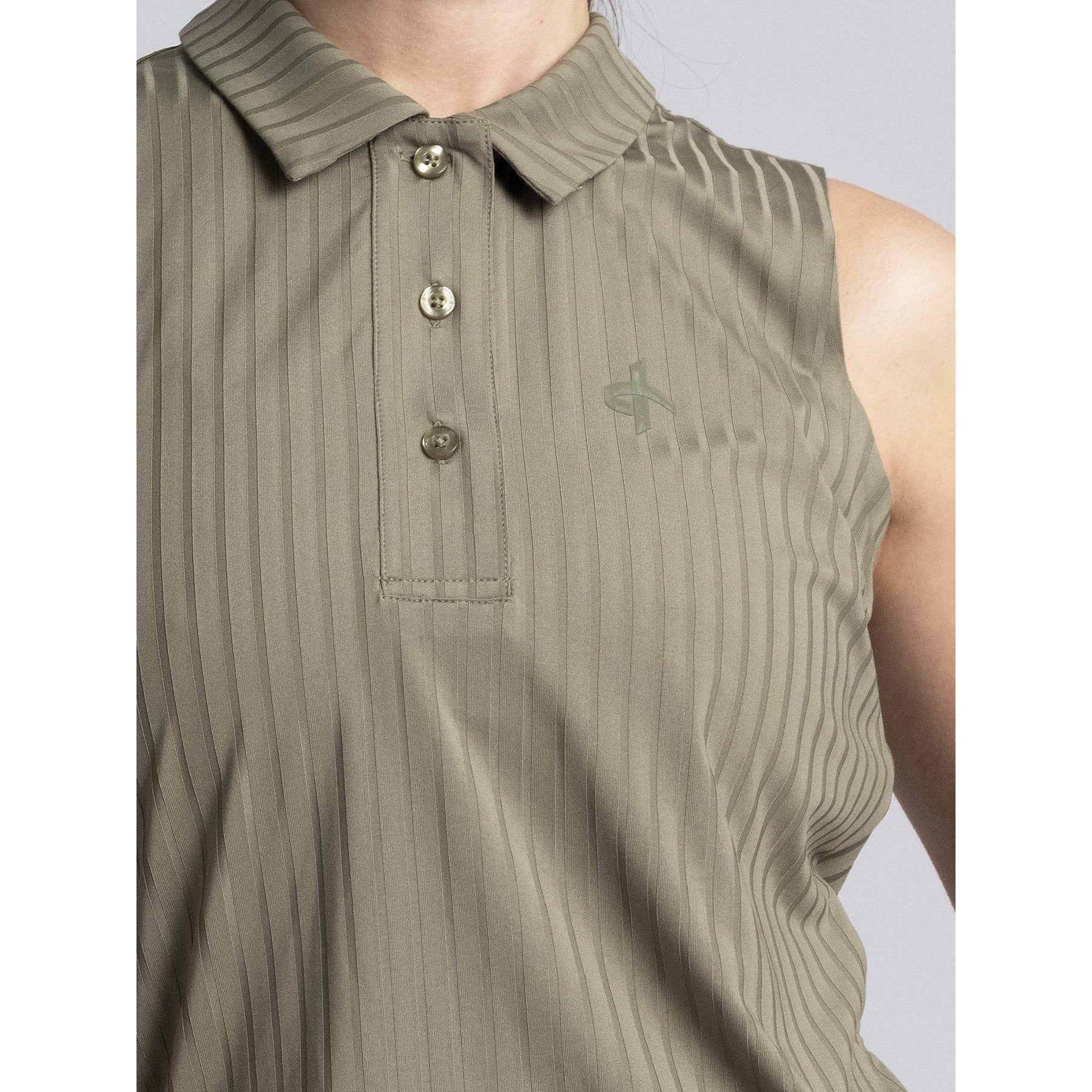 The Cross Women's Andrea Sleeveless Polo Golf Shirt is a lightweight and elegant choice for warm days on the course. Made from a unique jacquard-knitted rib fabric, it features a soft drape and built-in stretch that moves effortlessly with you. With a sleeveless design and a fitted armhole construction, this polo delivers a clean, tailored silhouette that performs as well off the course as it does on it.