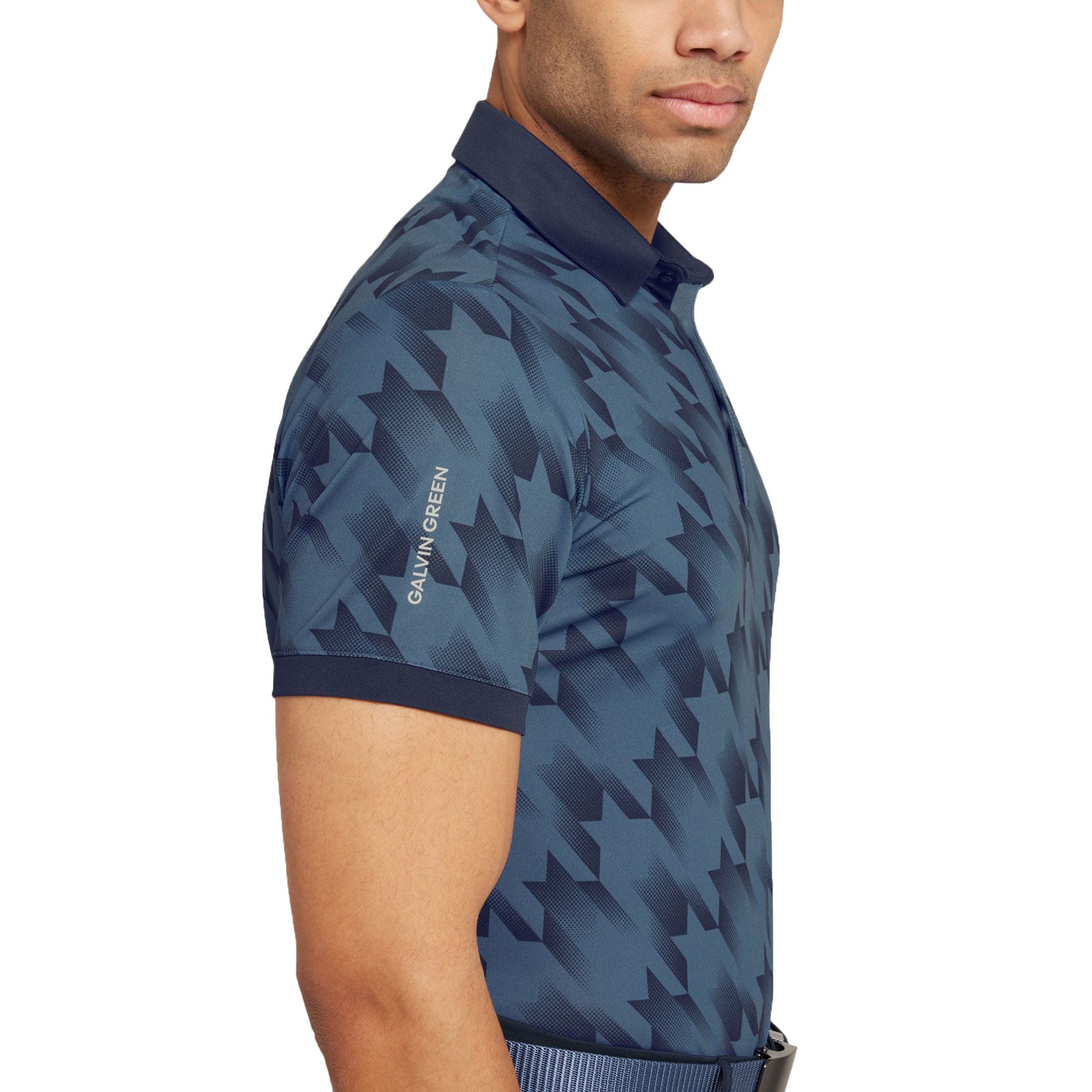 Designed for golfers who want to stand out, the Galvin Green Miles Golf Polo makes a bold statement with its oversized graphic houndstooth print. Crafted from VENTIL8™ PLUS fabric, it offers extreme breathability, rapid quick-dry performance, and UV 20+ protection to keep you cool, dry, and comfortable in sunny conditions. The stretch material ensures unrestricted movement, while the tailored collar and sleeve end cuffs deliver a refined, athletic look.