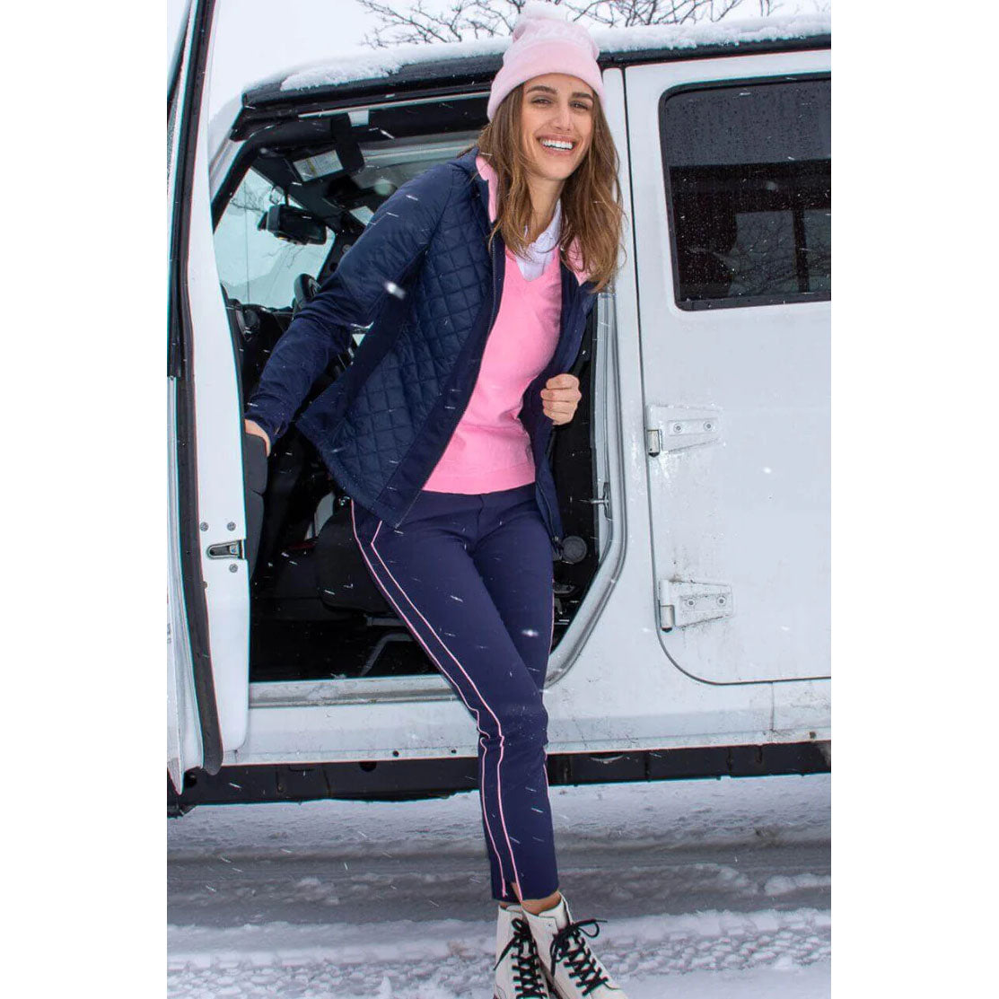 Introducing the Golftini Women's Hooded Wind Breaker Jacket – a versatile, technical jacket that’s perfect for year-round wear. Designed for both performance and style, this lightweight and functional jacket is ideal for layering on and off the course. The classic navy quilted fabric pairs beautifully with a rose pink hood, adding a cute accent to this must-have piece.