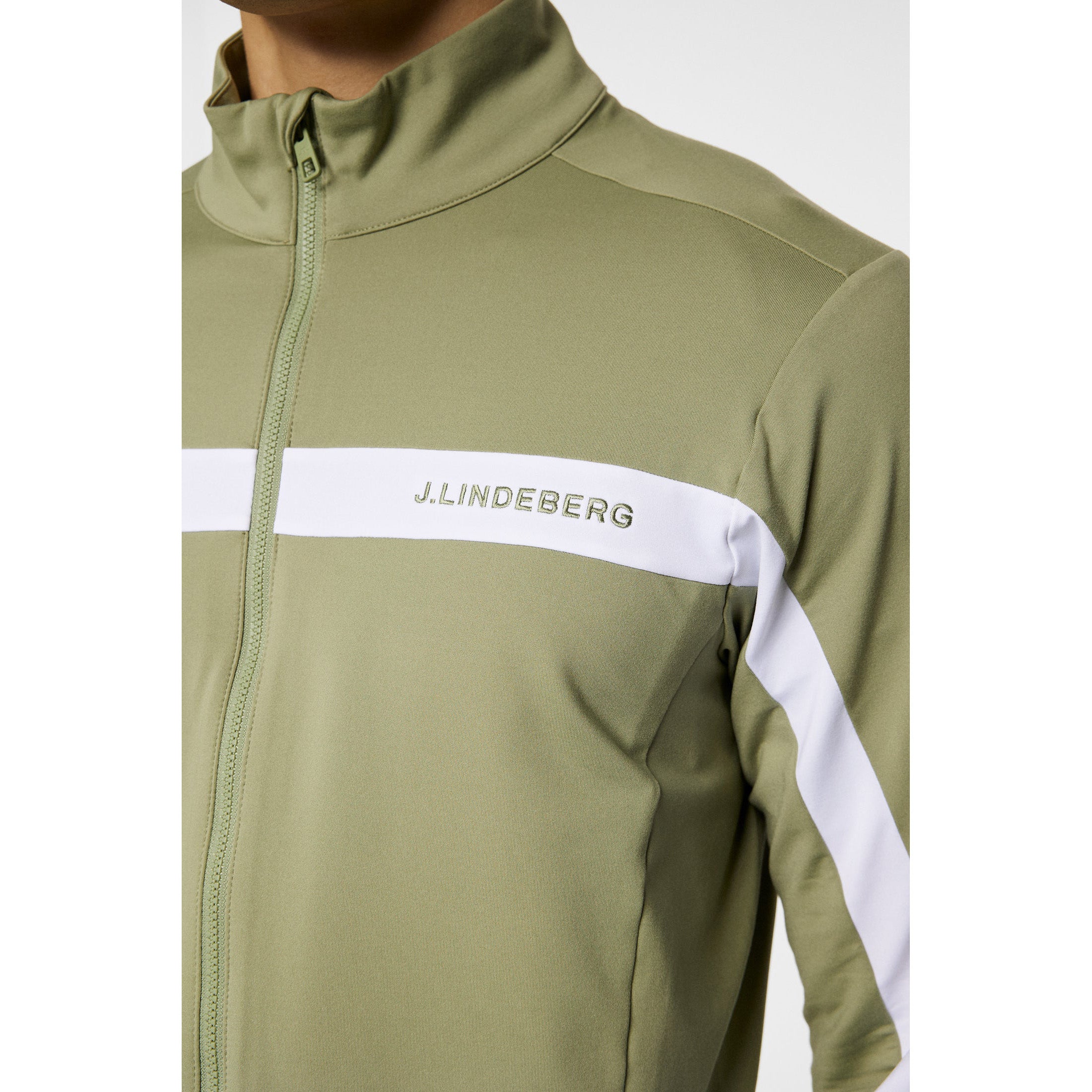 Features J.Lindeberg embroidery at the chest and a cut-and-sewn contrast bridge detail at the back, adding a modern, distinctive touch.