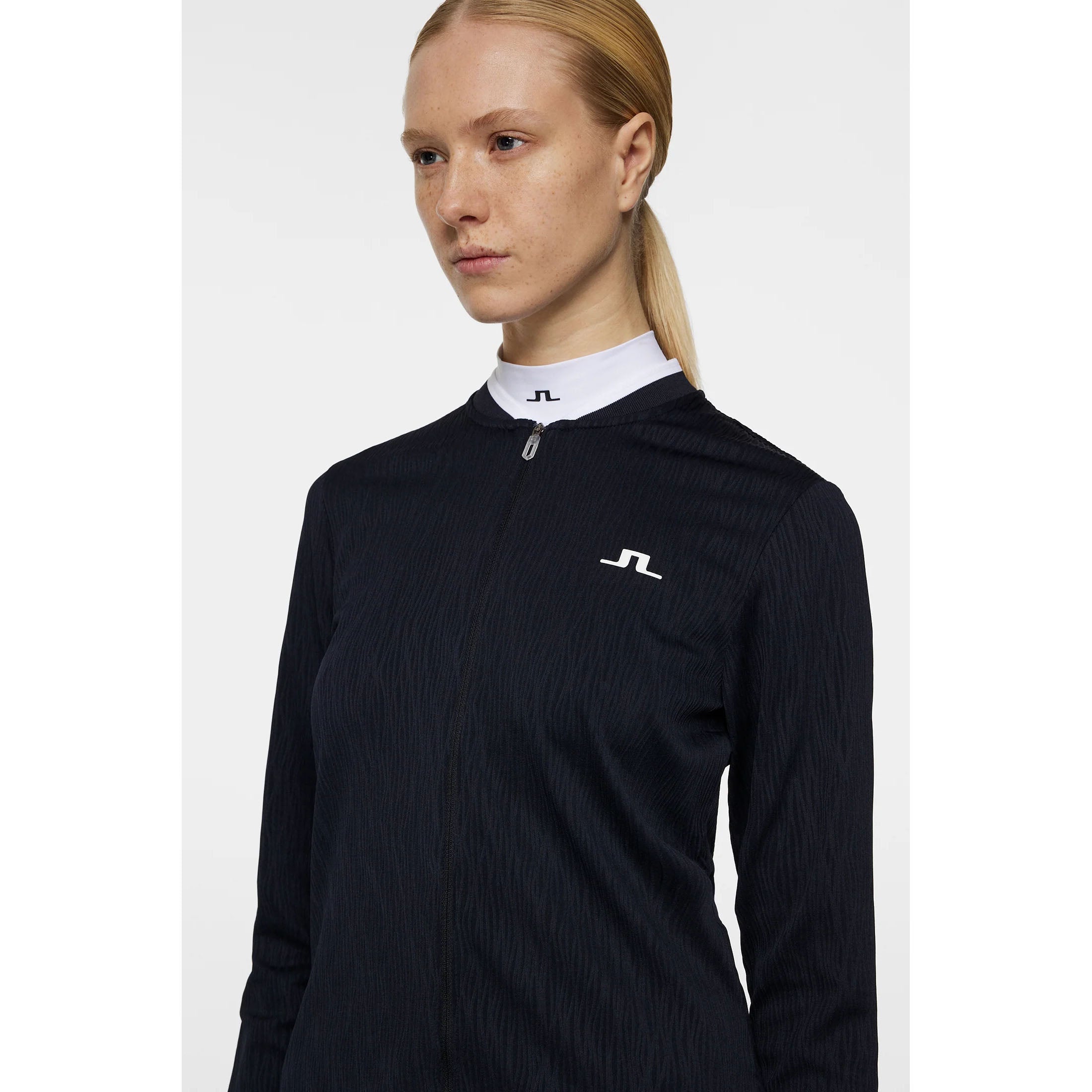 Designed for both style and performance, the J.Lindeberg Women's Susanna Golf Mid-Layer is a versatile essential for any golfer. Crafted in premium wave ribbed jersey, this mid-layer boasts a distinctive 2-way full zip front, accented by contrasting striped cuffs and collar for a sleek, modern aesthetic. The firm stretch of the ribbed structured fabric not only ensures unrestricted movement but also creates a refined silhouette—making it an effortless choice for layering.