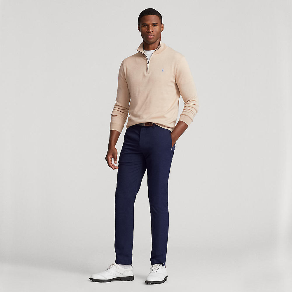 This Polo Performance Ralph Lauren quarter-zip knit features COOLMAX and wool fibers, keeping you cool, dry, and comfortable by wicking away moisture. This timeless sweater is ideal for golfing in the cool weather and has a quarter-zip placket, mock/funnel neck, and rib-knit cuffs/waist. Made with a high-quality wool blend, it seamlessly combines warmth and sophistication. Perfect for the golf course or a casual day, the Ralph Lauren Polo Golf Wool Blend knit has a regular fit for both comfort and style, finished with an embroidered pony logo on the front left chest.