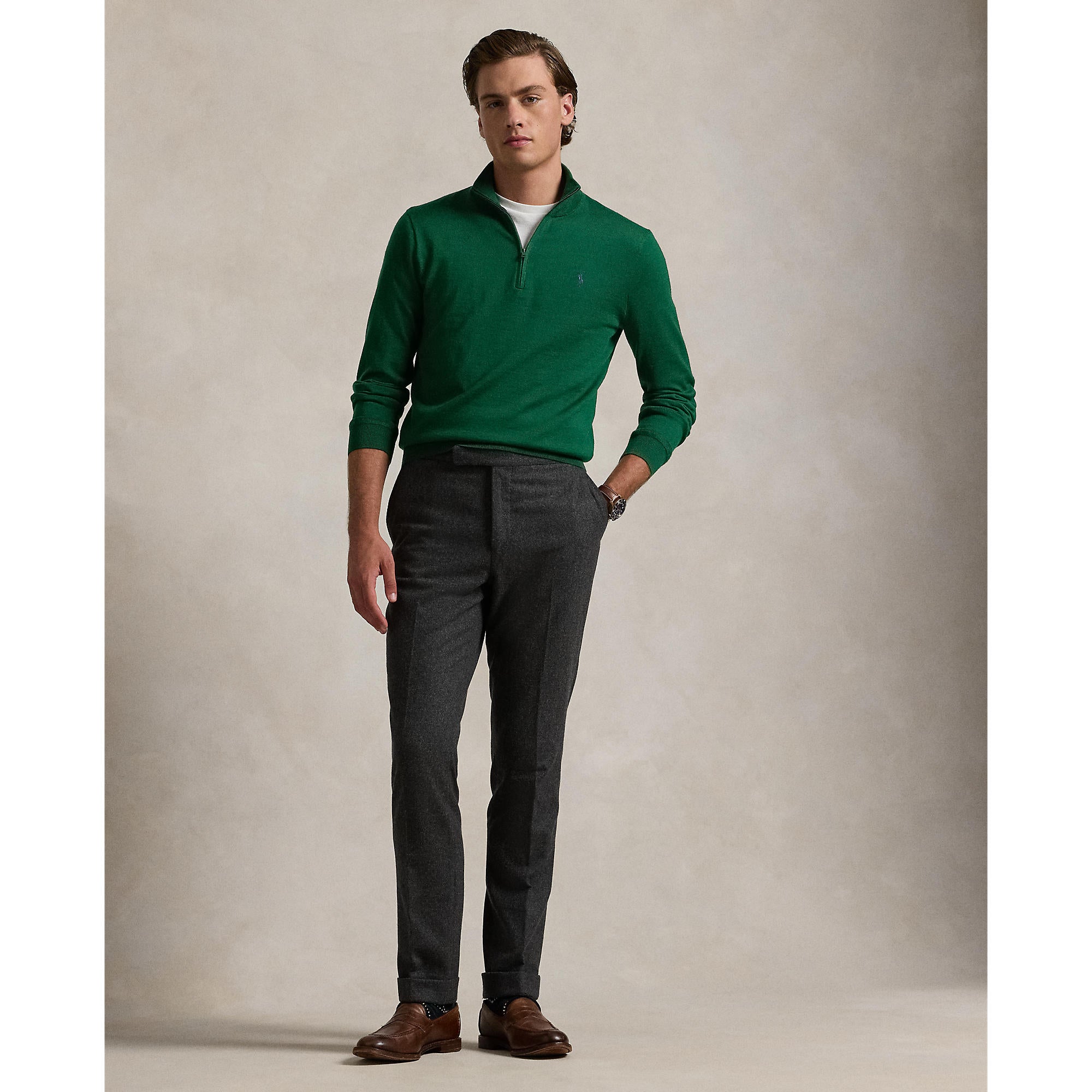Key Features: -Regular Fit: Designed with a wider chest for comfort while maintaining a modern silhouette. -Moisture-Wicking Performance: COOLMAX® fibers help regulate body temperature by drawing moisture away to keep you dry and cool. -Sustainable Construction: Made from a recycled polyester blend with wool, offering both warmth and breathability. -Classic Quarter-Zip Design: Features a rib-knit mockneck and a quarter-zip placket for adjustable coverage and style. -Premium Detailing: Long sleeves with rib-knit cuffs and a rib-knit hem for a polished, structured look. -Iconic Branding: Finished with the signature embroidered Pony on the left chest for a touch of Ralph Lauren heritage. -Easy Care: Machine washable for convenience and durability. -The model is 6'1" (185 cm) and wears a size medium.