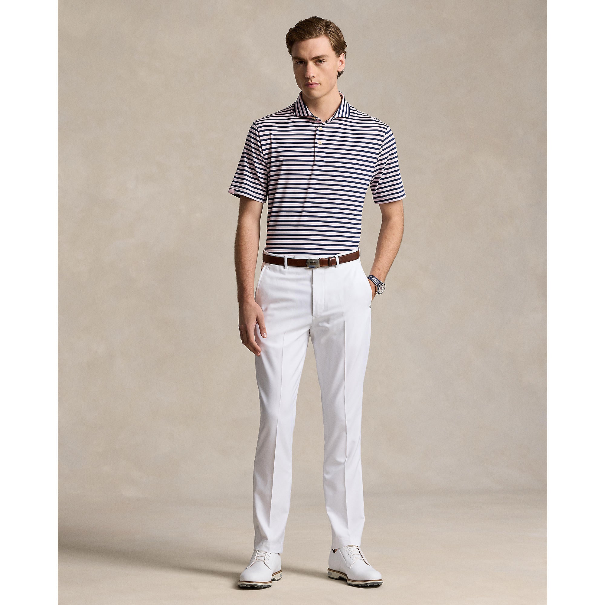 With its lightweight, moisture-wicking fabric and bold striped design, this polo delivers superior comfort and performance on the golf course while maintaining a sophisticated, sporty aesthetic.