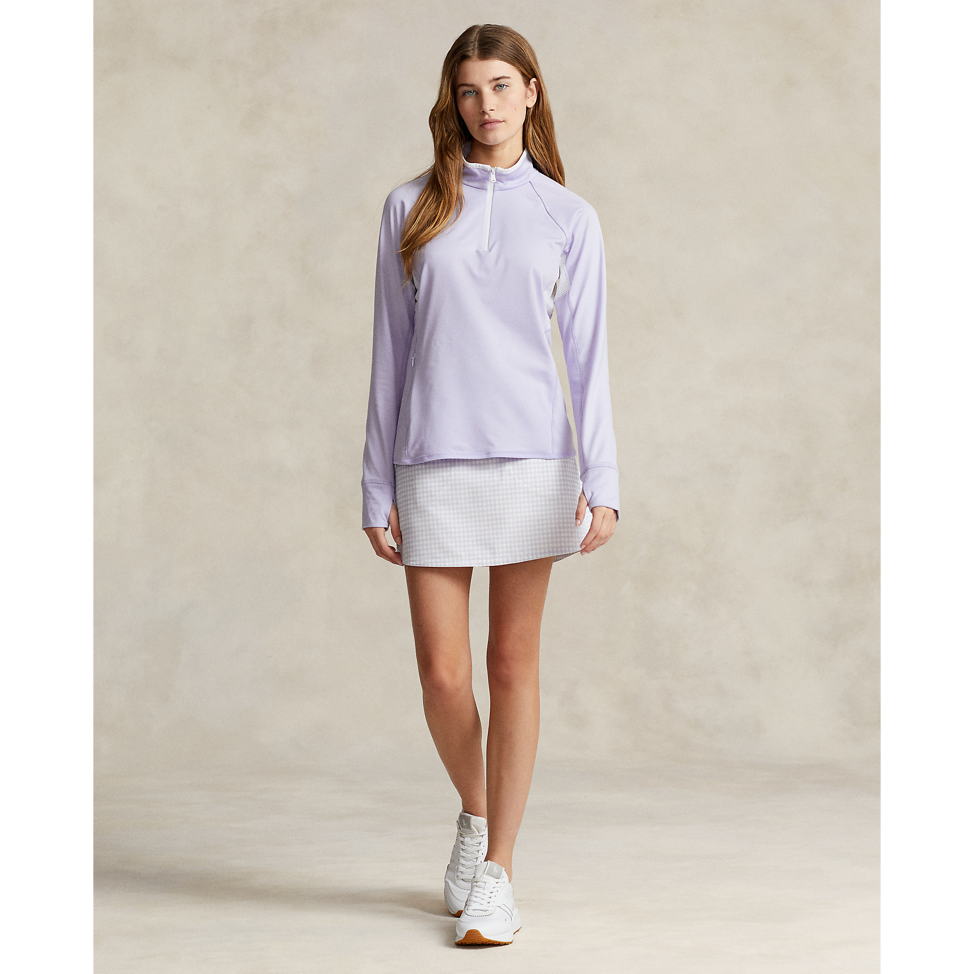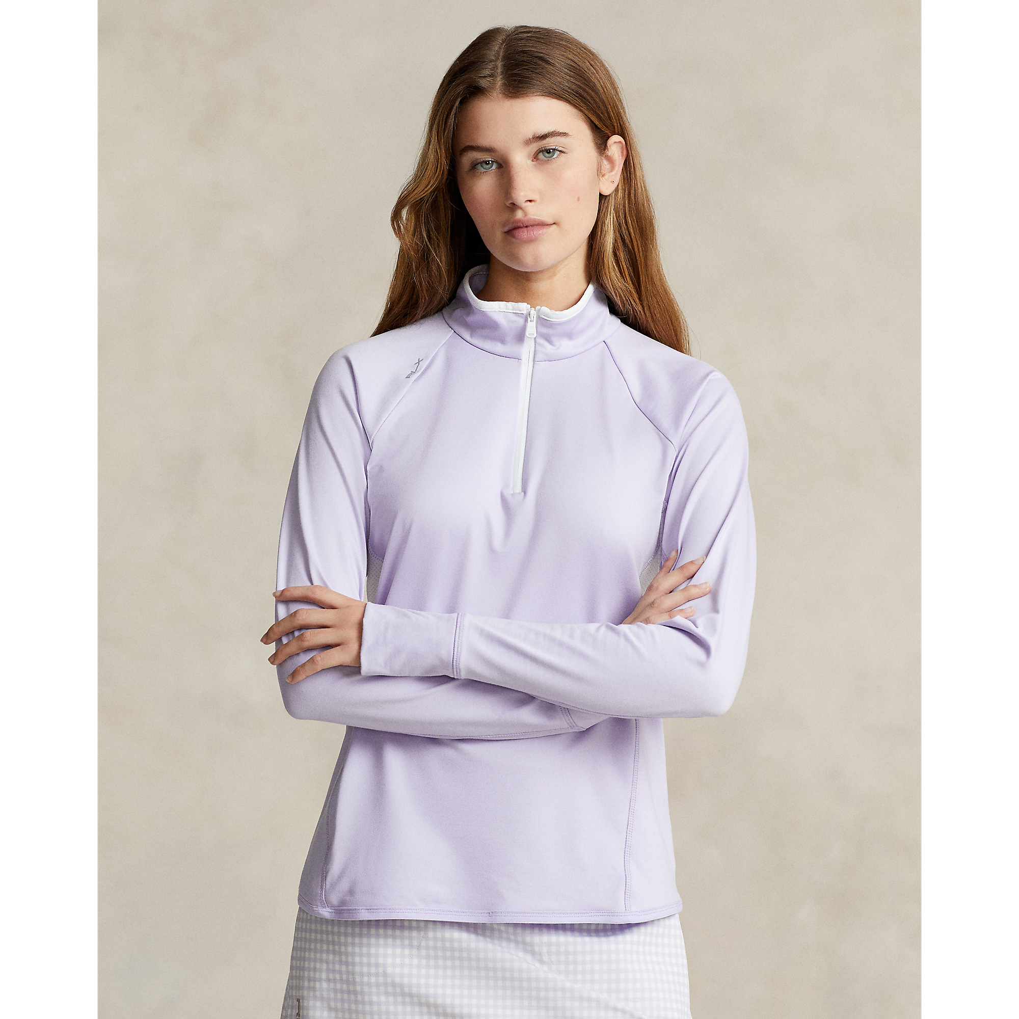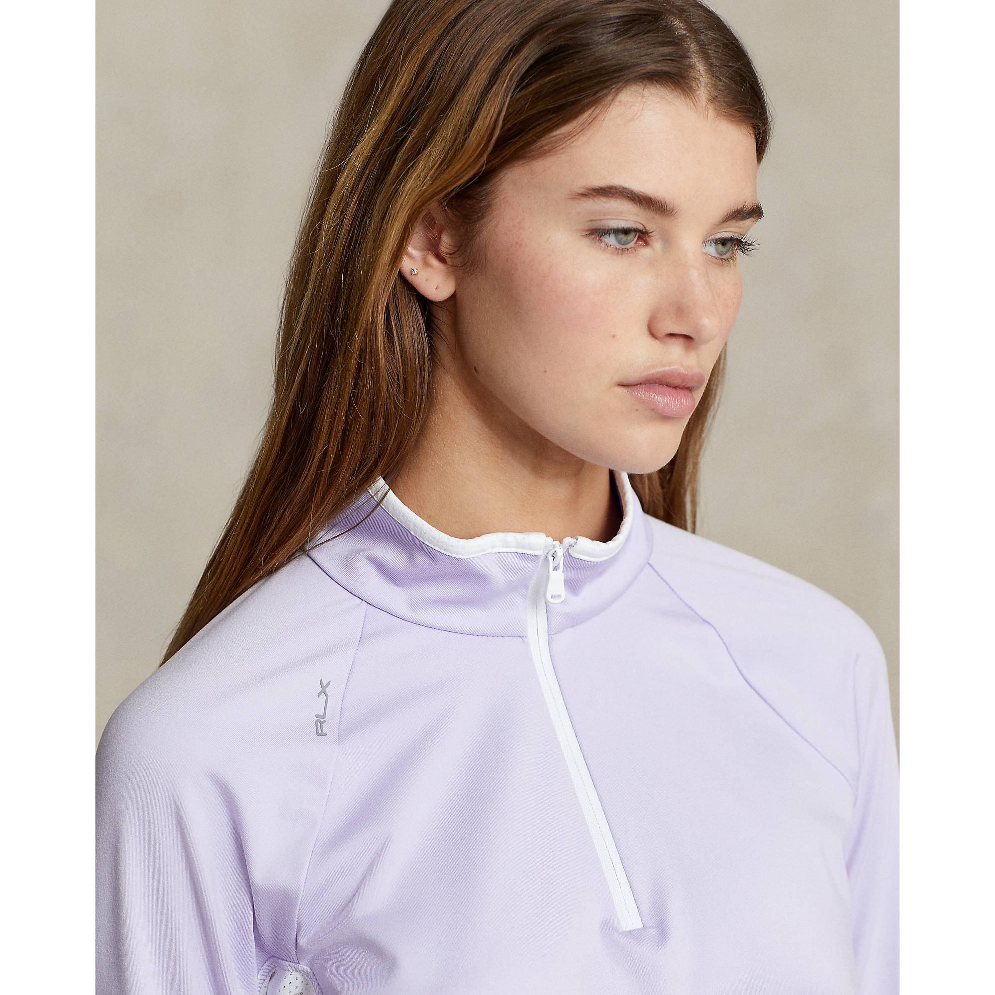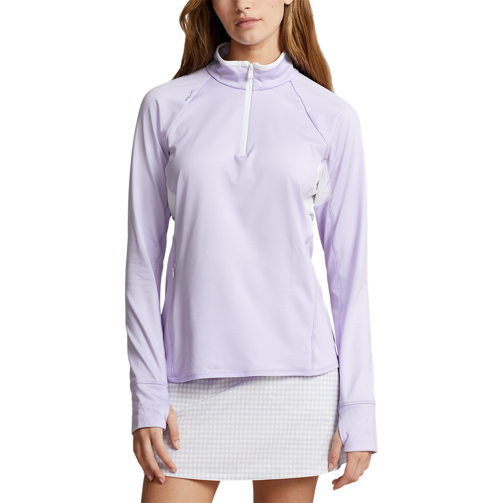 Straight fit Intended to hit at the hip Size medium has a 25" front body length, a 24.25" back body length, and a 33" sleeve length Mockneck Quarter-zip placket Long raglan sleeves Sewn cuffs with thumbholes Mesh panels at the underarms Side panels Right waist on-seam zip pocket Back yoke "RLX" printed at the right shoulder 87% Polyester / 13% Elastane Machine washable