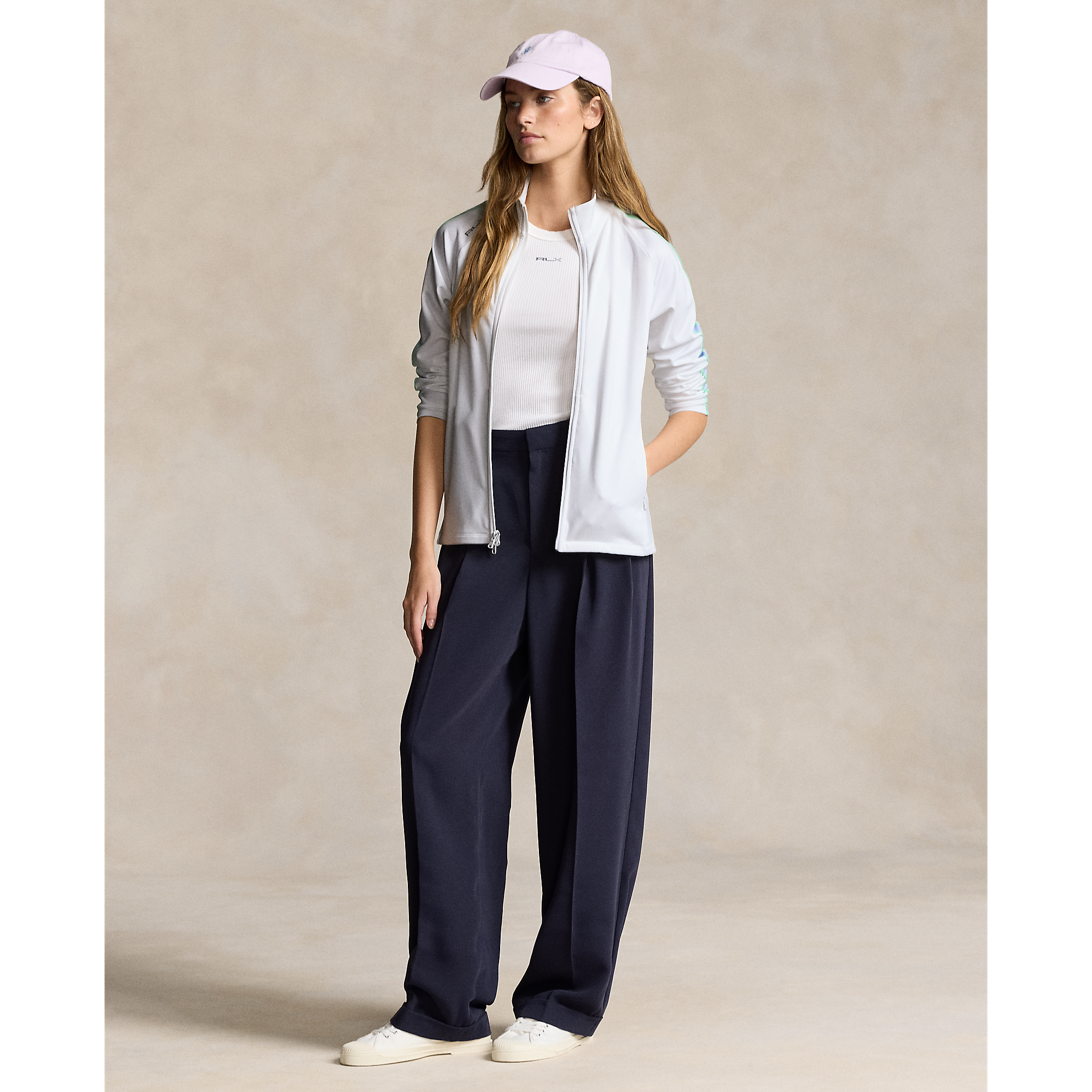 Rendered in soft peached jersey with a generous amount of stretch, this zip-front jacket features a paneled construction with contrast arm-stripes and our signature "RLX" rubber-printed logo