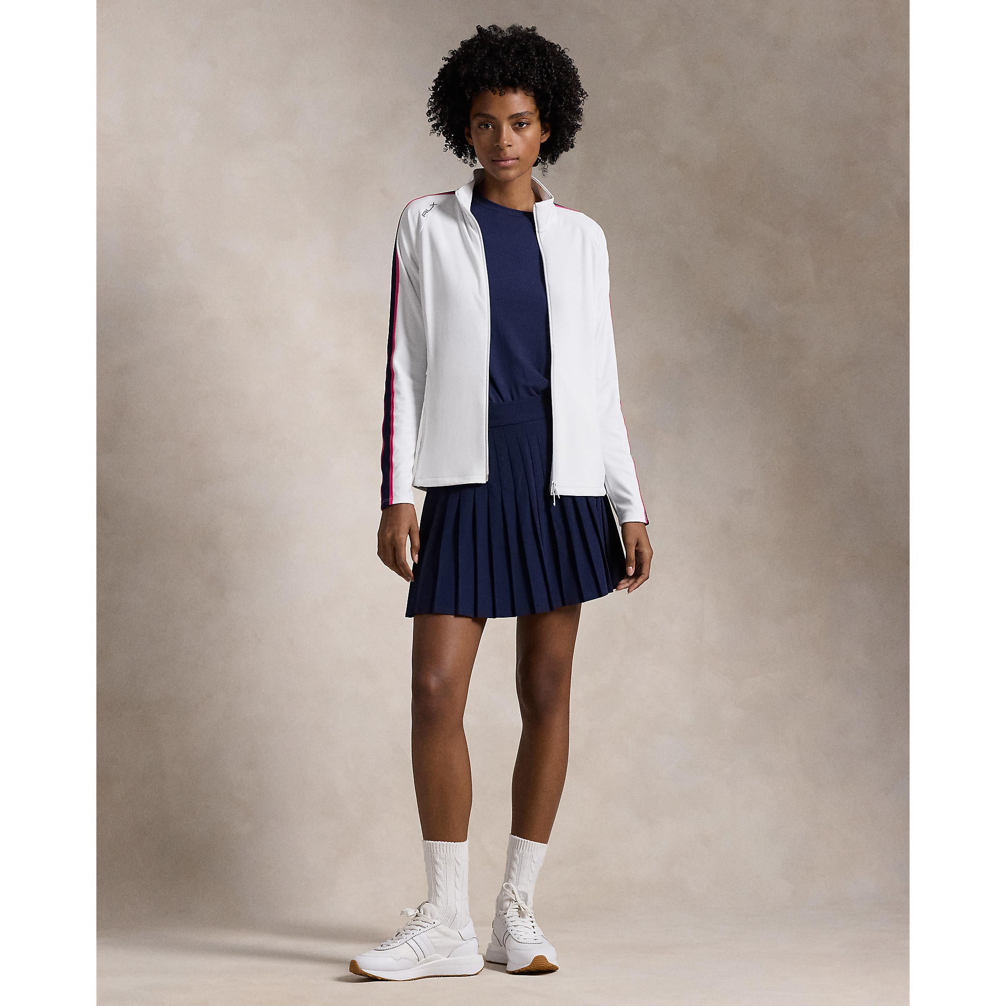 The RLX Ralph Lauren Women's Power Stretch Mockneck Zip Jacket in Ceramic White Multi is designed to blend performance with style. Offering a slightly slim fit with generous stretch, this jacket ensures unrestricted movement while maintaining a sleek, active look. Crafted from a soft peached jersey fabric, it’s ideal for both sports and casual wear.