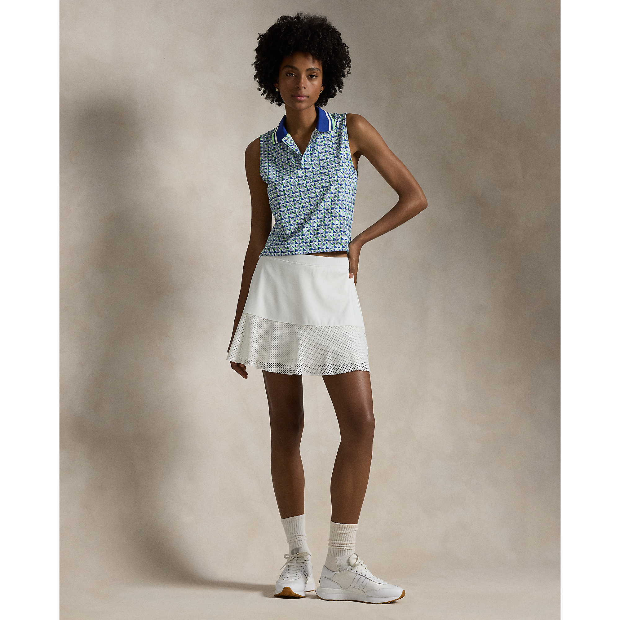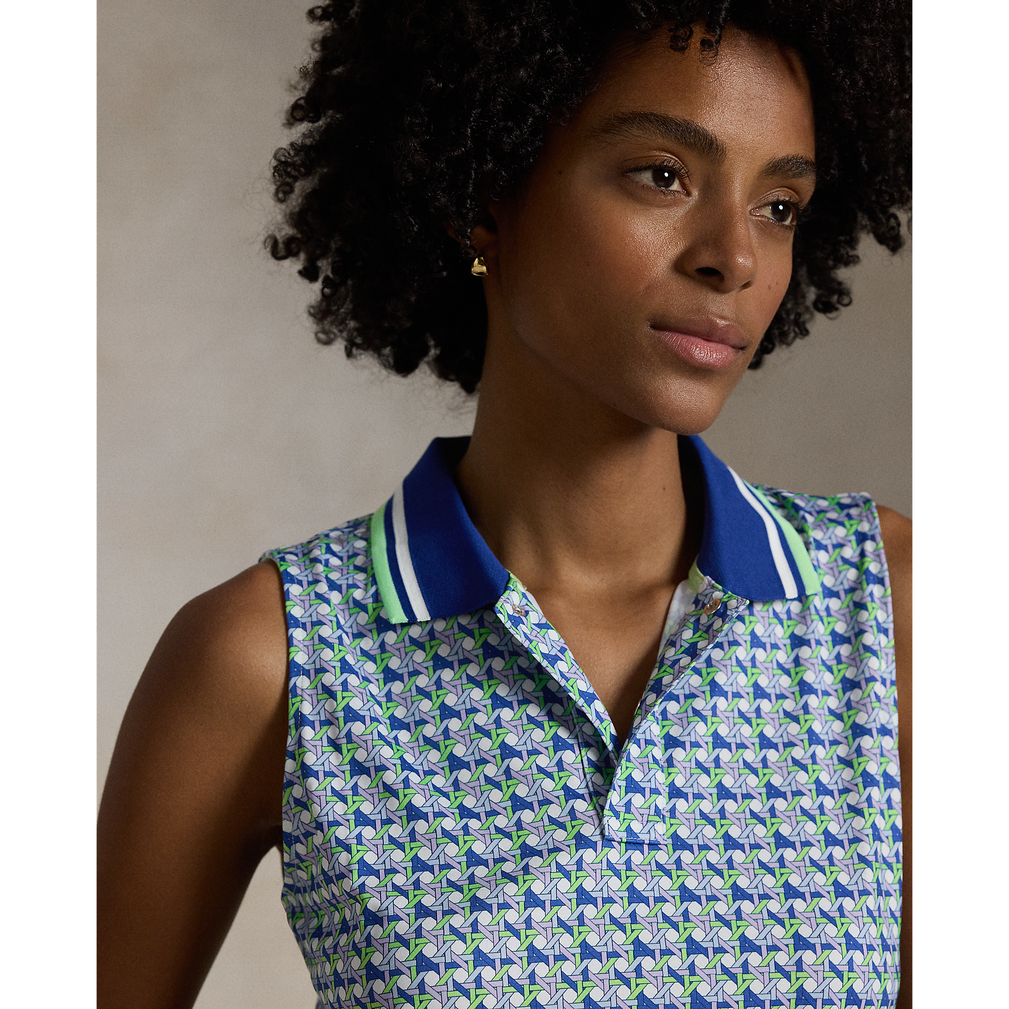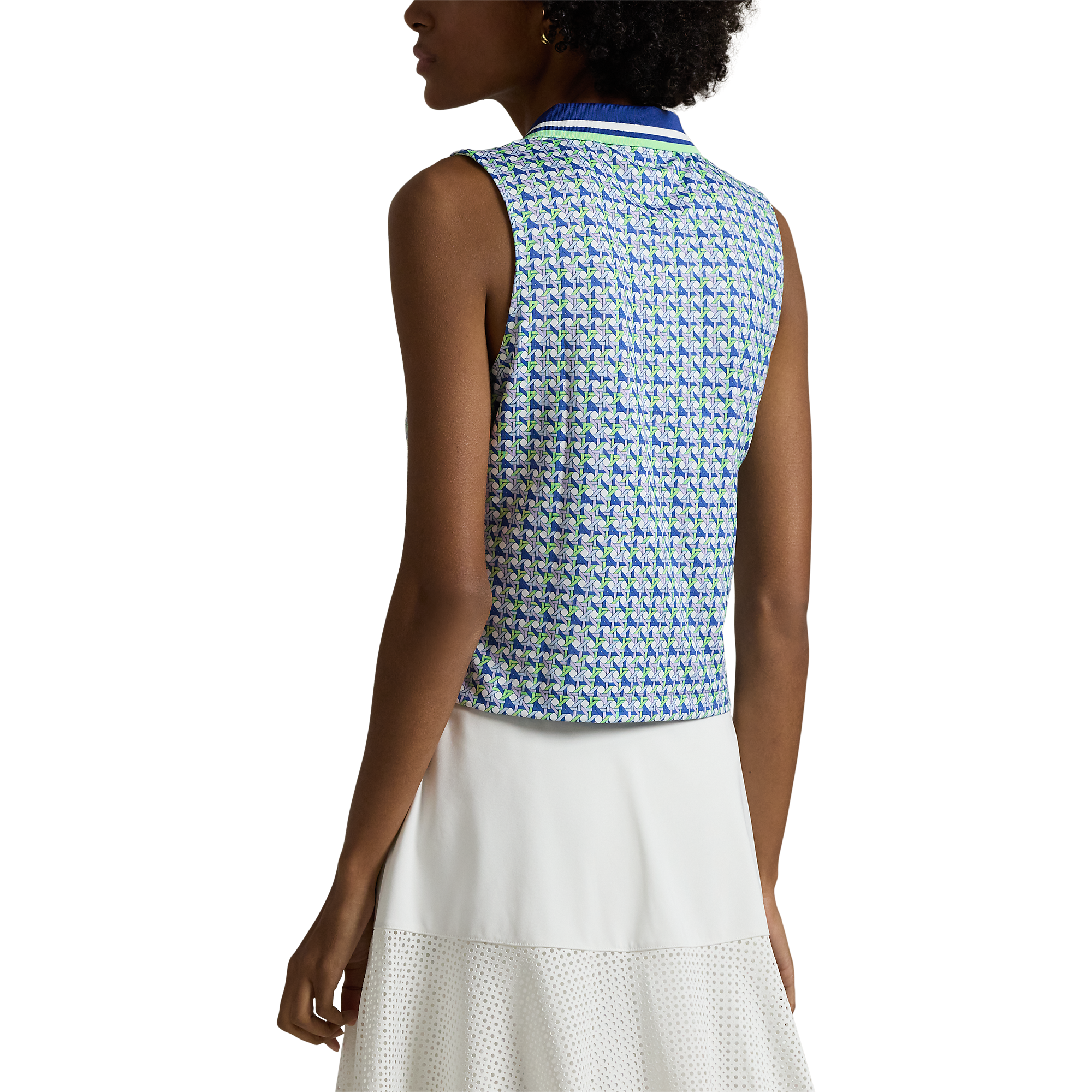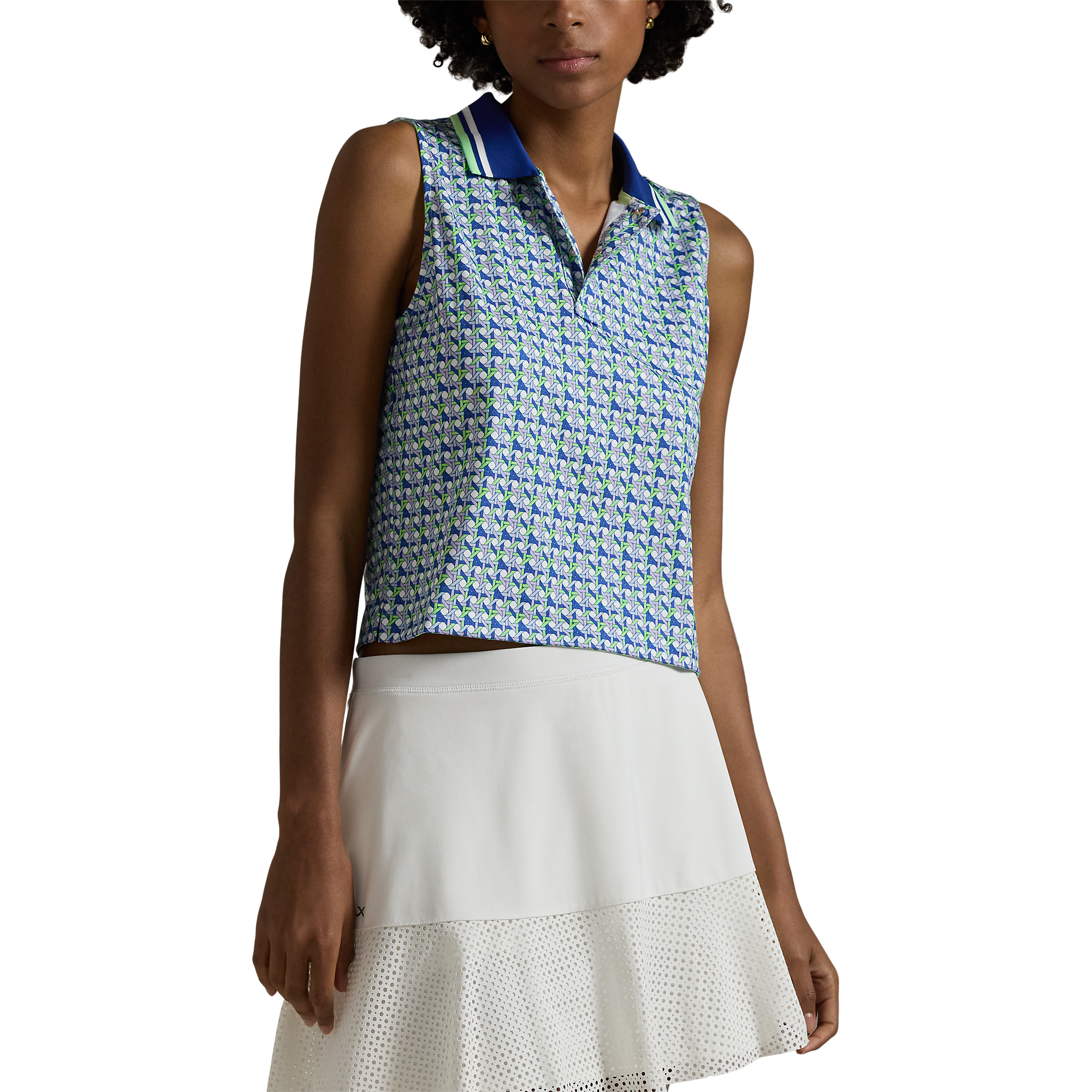 This sleeveless, cropped version of our Polo shirt is made with stretch jersey and features a small-scale graphic pattern. It's accented with striped tipping at the collar and our printed "RLX" logo at the right shoulder.