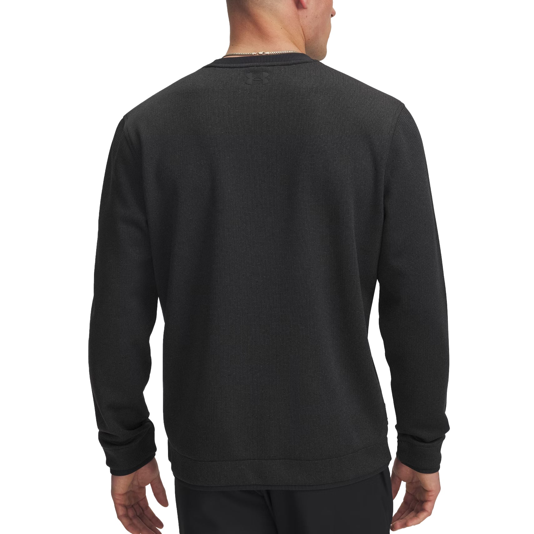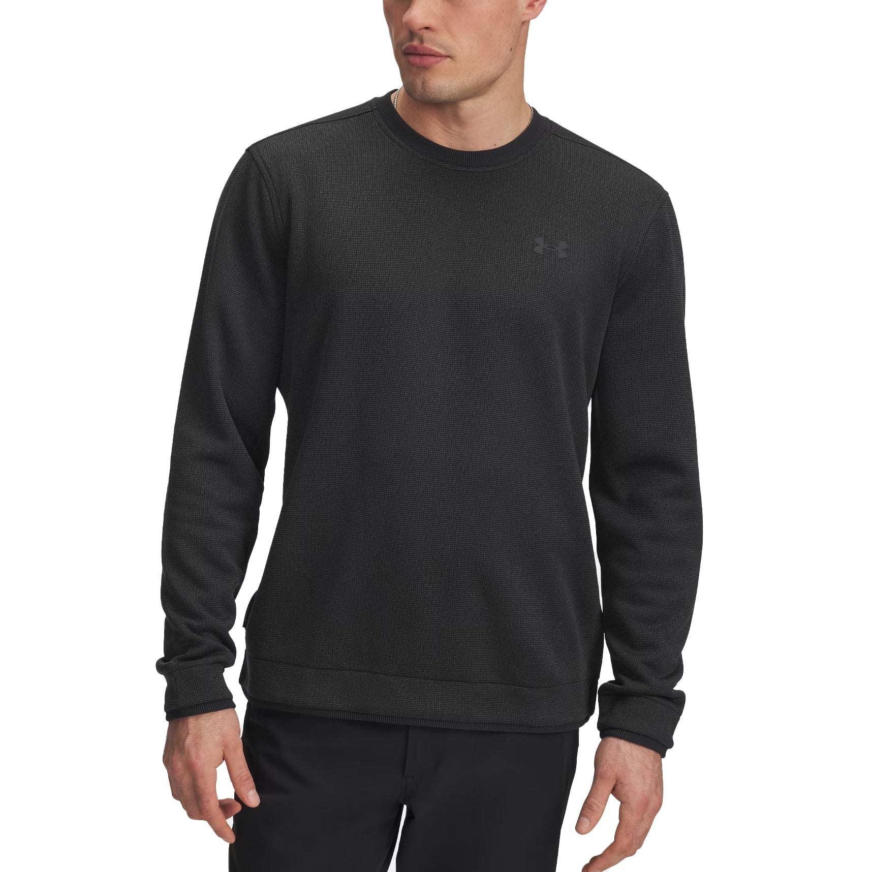 UA Storm technology repels water without sacrificing breathability SweaterFleece fabric with subtle grid texture has a soft, brushed interior with stretch for complete mobility Ribbed details at collar, bottom hem & cuffs Built-in tee holder on wearer's right side Fit - Loose: Fuller cut for complete comfort.